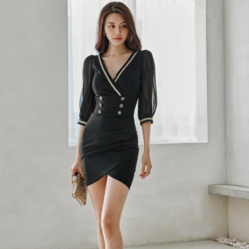 ゴールドボタンがアクセントの洗練されたミニドレスです。