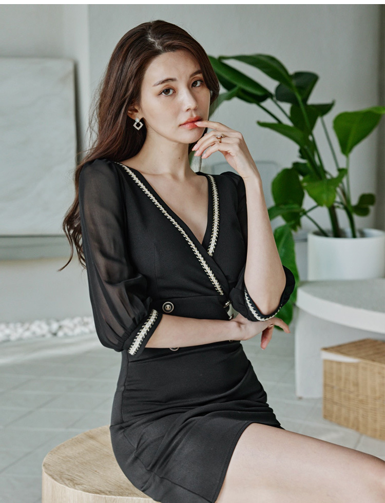 カシュクールデザインのブイネックが女性らしさを演出し、程よく体にフィットするタイトなシルエットですっきりと美しく見せます。