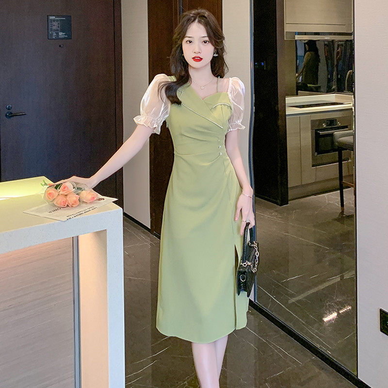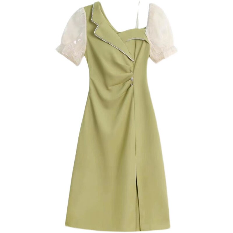 透け感のあるパフスリーブが女性らしさを引き立てる膝丈のキャバドレスです。
