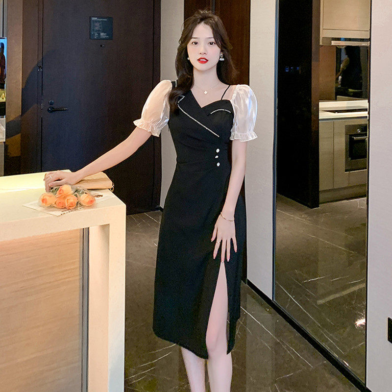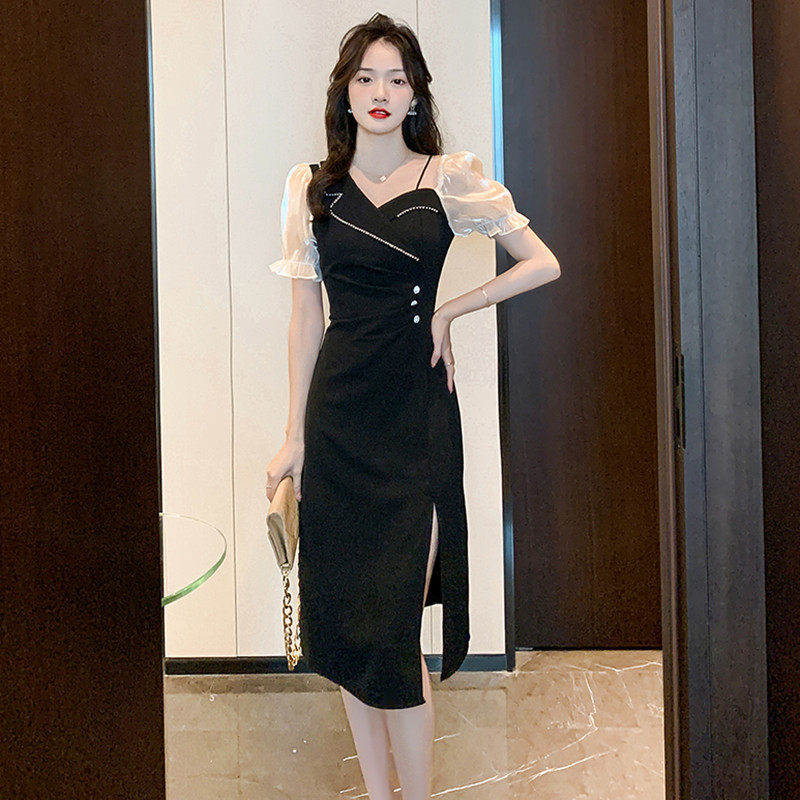 透け感のあるパフスリーブが女性らしさを引き立てる膝丈のキャバドレスです。 ボディラインを美しく見せる立体的なカッティングと、サイドのスリットがセクシーさをプラス。 上品さと可愛らしさを兼ね備えたデザインで、特別な夜を彩ります。 二次会やパーティーシーンにもおすすめの一着です。