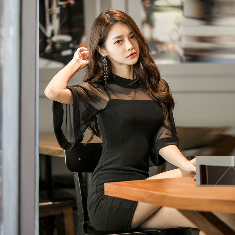 透け感のあるシースルー袖がエレガントで上品な印象を演出します。