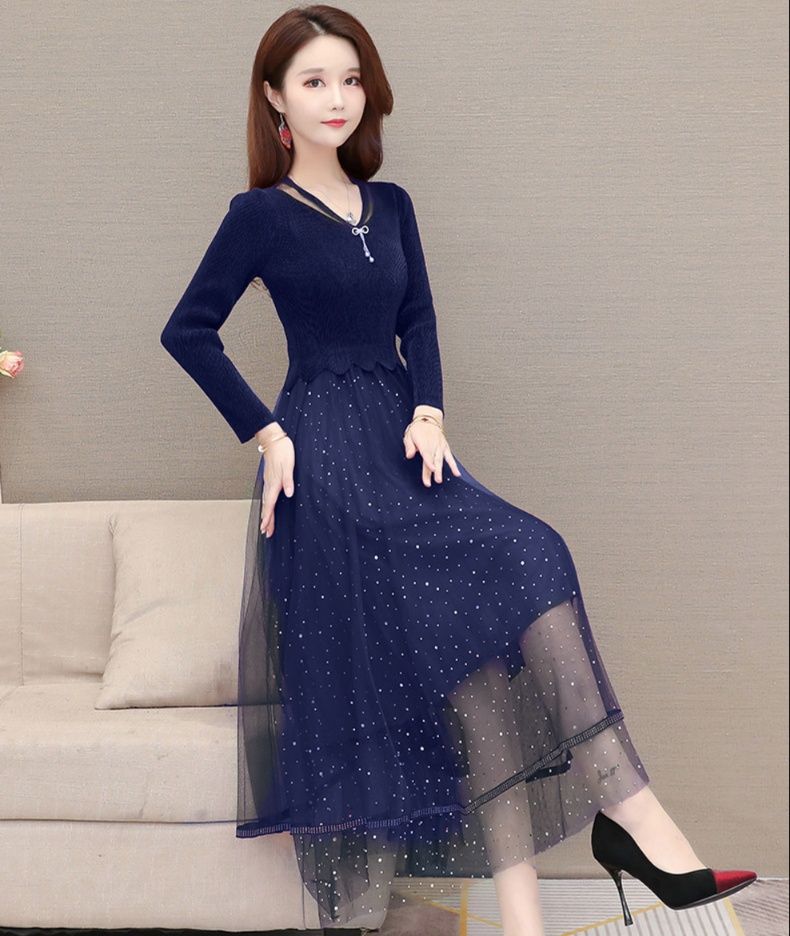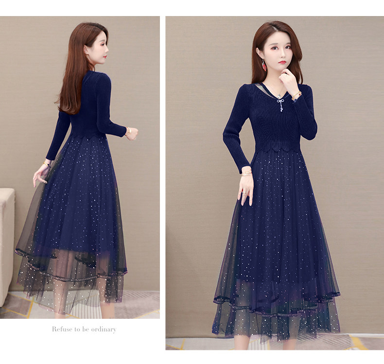 長袖のニットトップスと星屑のように輝くラメをちりばめたチュールスカートが見事に調和し、エレガントな雰囲気を演出します。