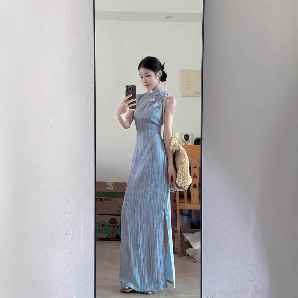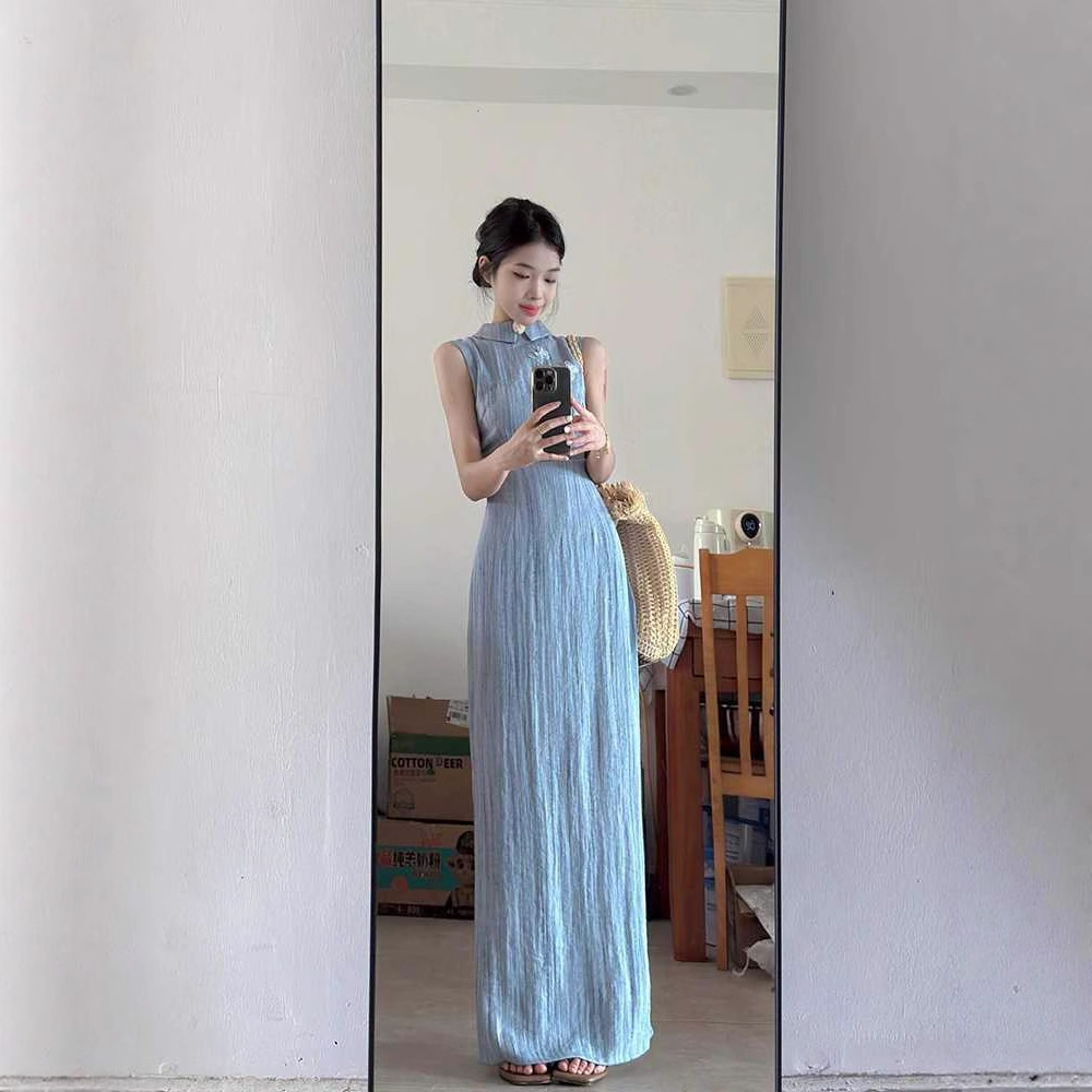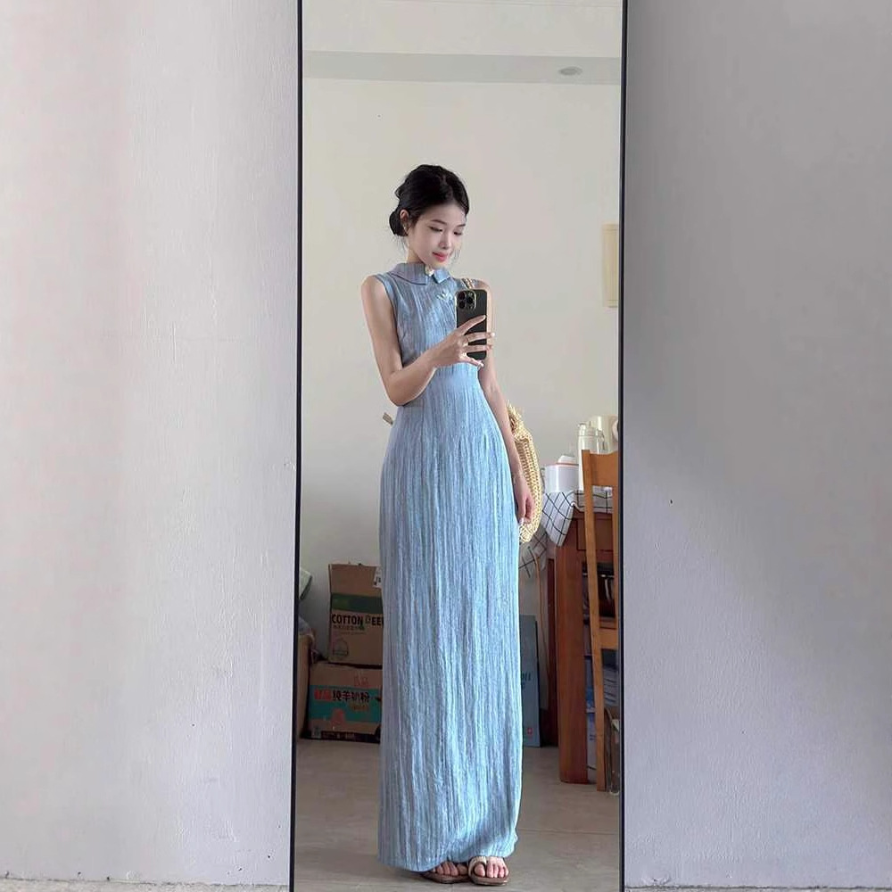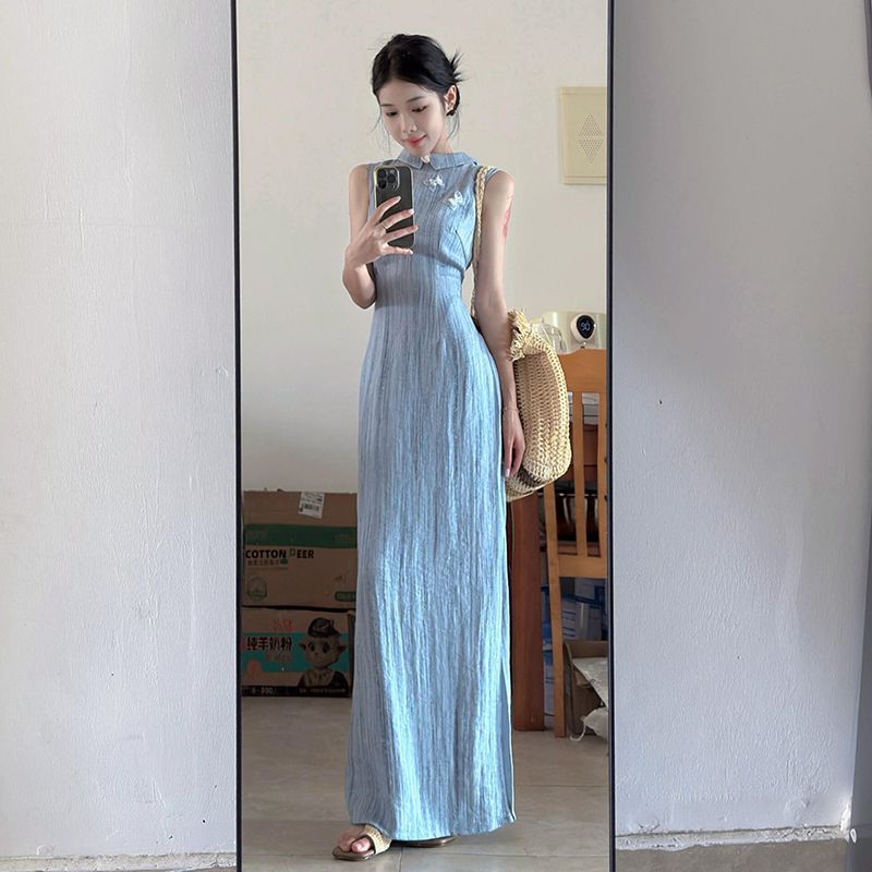 エレガントなブルーカラーの改良チャイナ風デザインが美しいキャバドレス。