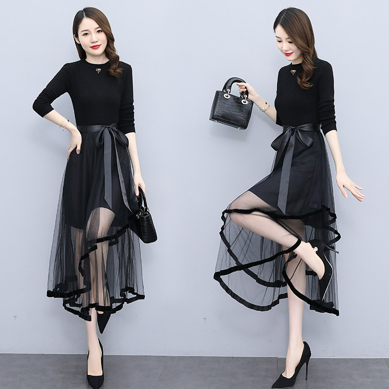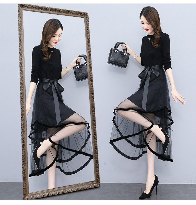 長袖のニット素材が上品な印象を演出し、透け感のあるチュールスカートが軽やかに揺れる優雅なシルエットを実現しました。