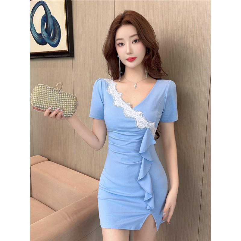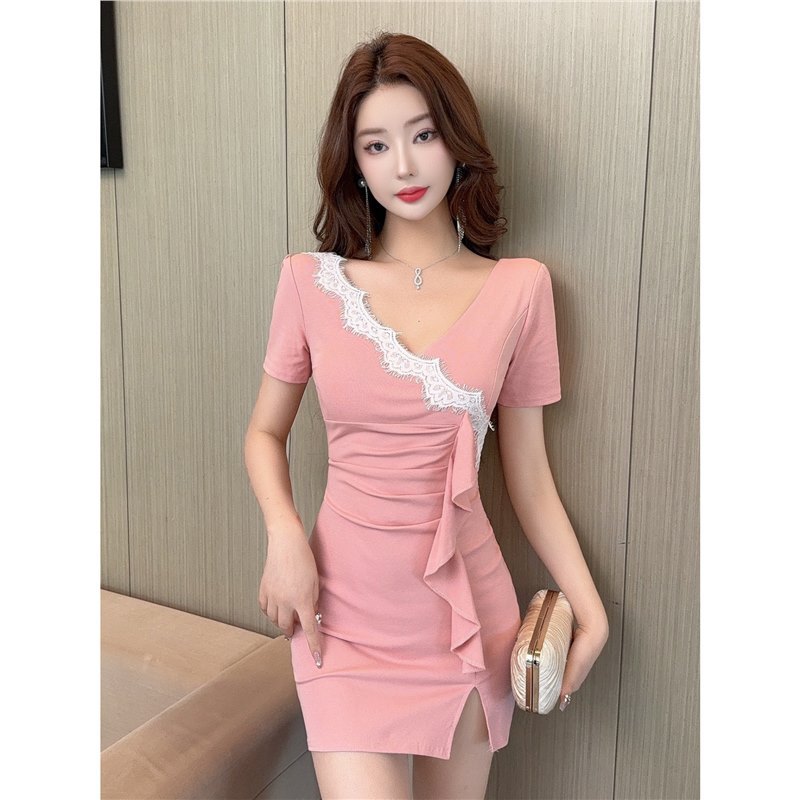 胸元を美しく魅せる深めの襟ぐりに、上品なレース装飾が施されたキャバドレスです。