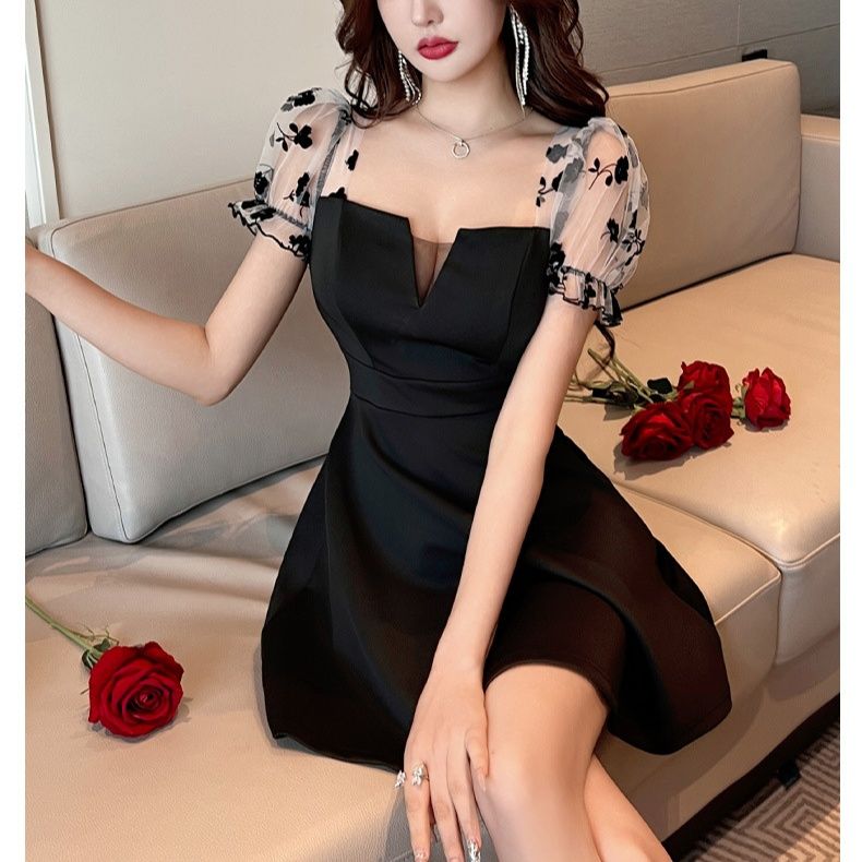 華やかな花柄刺繍が施されたシアー袖が魅力的なキャバドレスです。