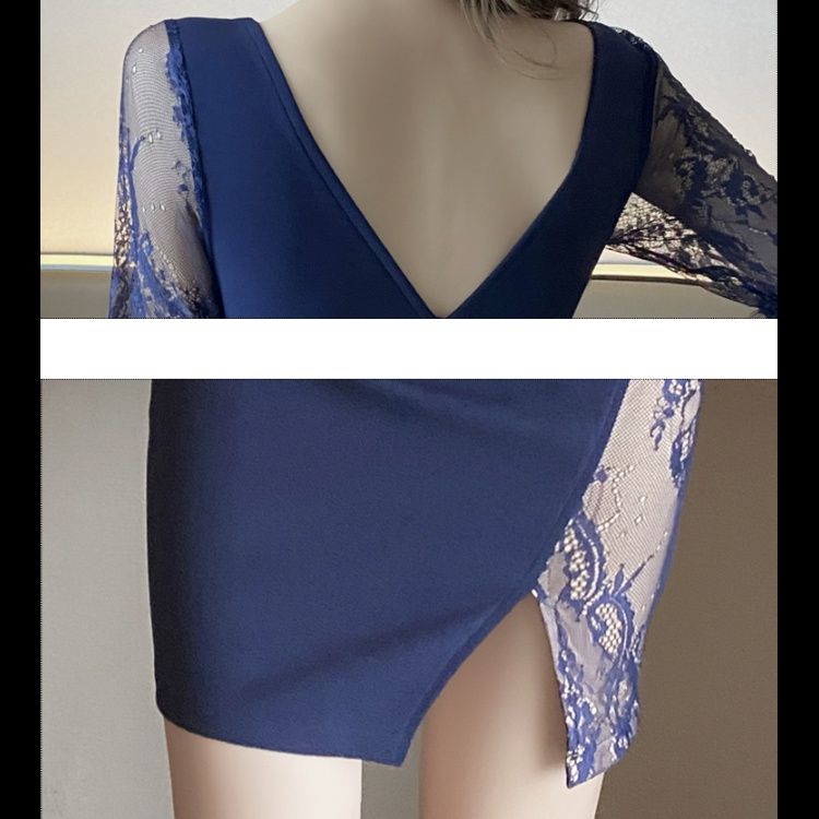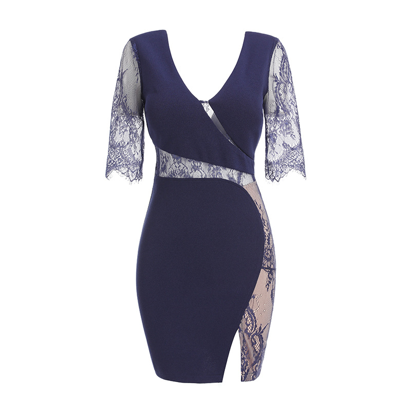 体のラインを美しく見せるタイトシルエットのミニ丈で、ウエスト部分のレース切り替えがアクセントになっています。