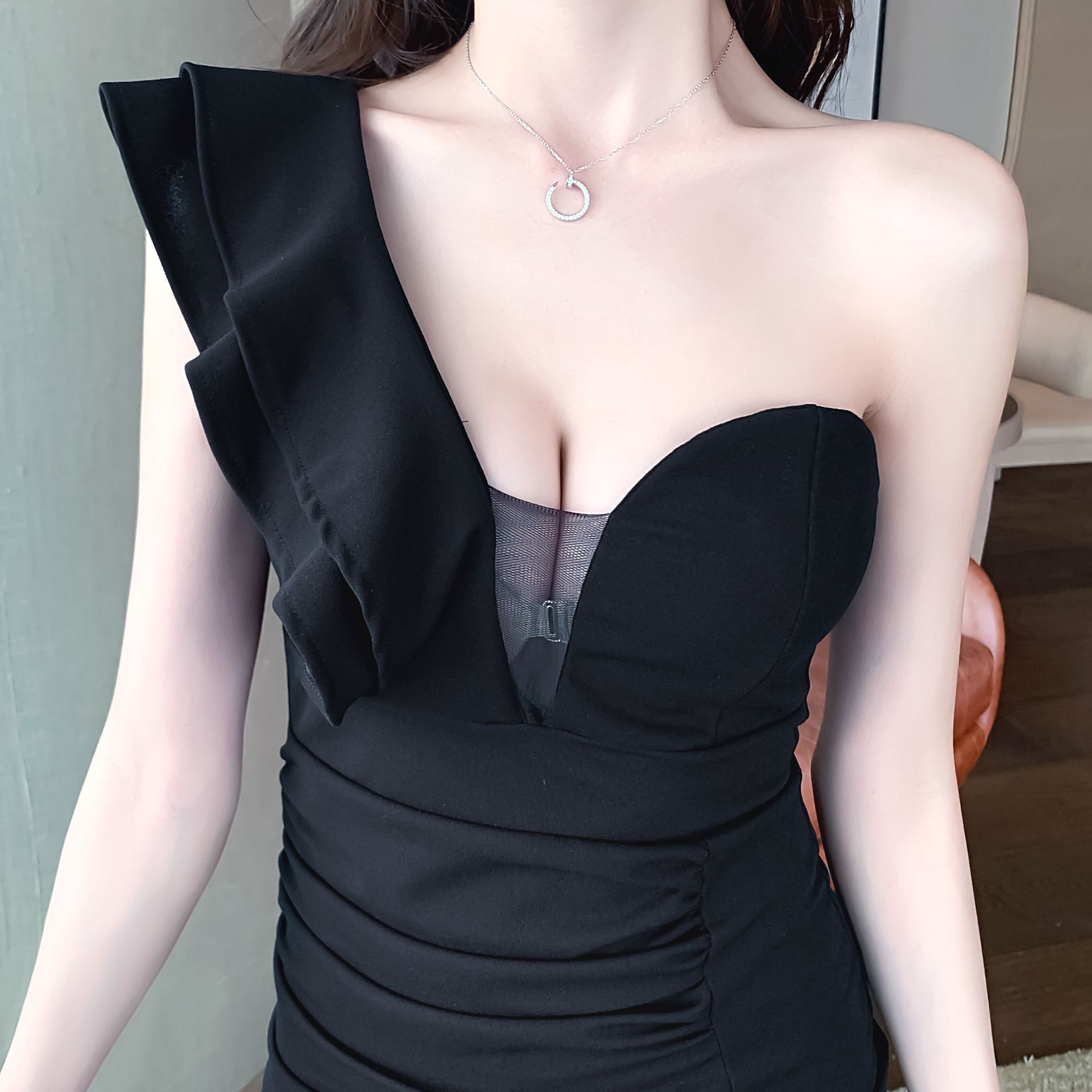 ビスチェ風の胸元の切り替えが美しいバストラインを演出し、女性らしさを際立たせます。