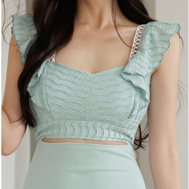 肩に施された繊細なフリルが甘さをプラスし、ハートネックラインが女性らしいデコルテを美しく演出します。