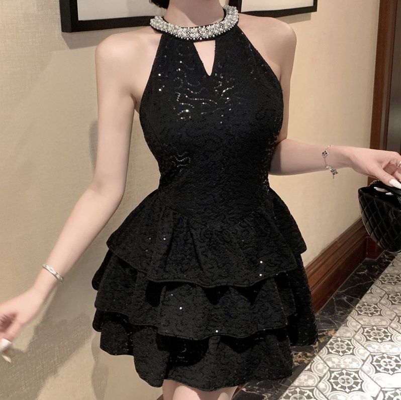 スパンコールが散りばめられた生地は光を受けて美しく輝き、裾に向かって広がる段フリルが動くたびに優雅に揺れます。