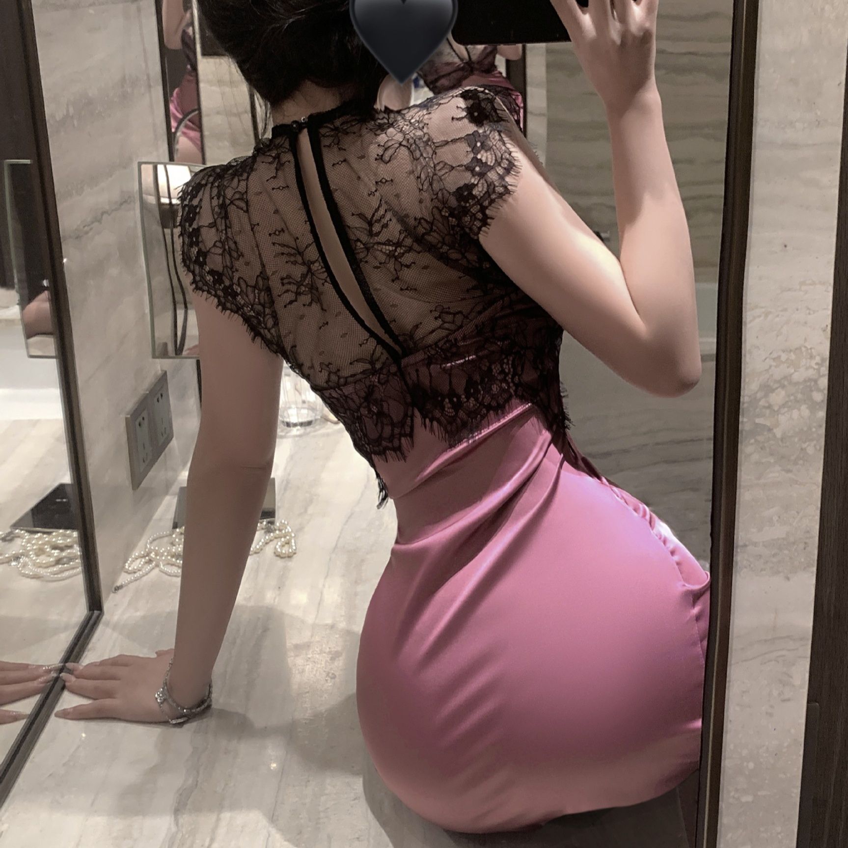 胸元の繊細なレースとチャイナボタンが大人の色気を演出し、センター開きのデザインが視線を集めます。