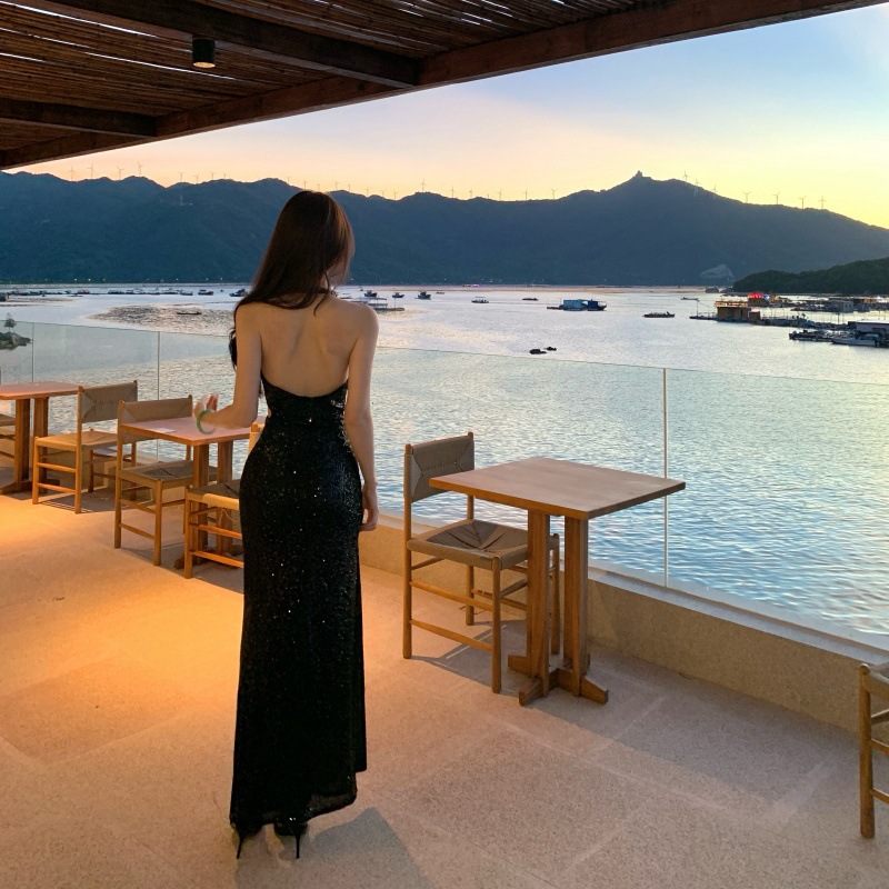 深く開いた胸元のホルターネックデザインと、ウエスト部分の大胆なカットアウトが女性らしい曲線を際立たせます。