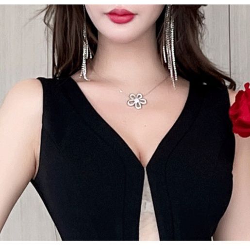 深めのVネックデザインが洗練された大人の魅力を引き出し、ウエストのビジュー装飾が煌めきをプラスします。