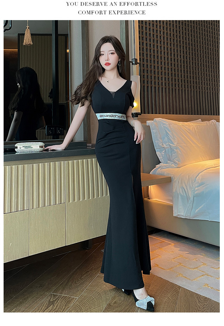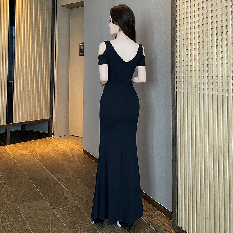 肩を美しく見せるオープンショルダーと、太ももまで大胆に入ったスリットが魅力的なスタイルを演出します。