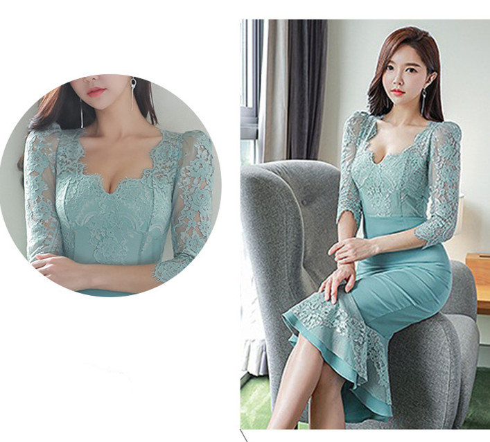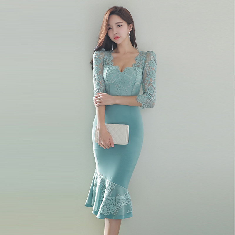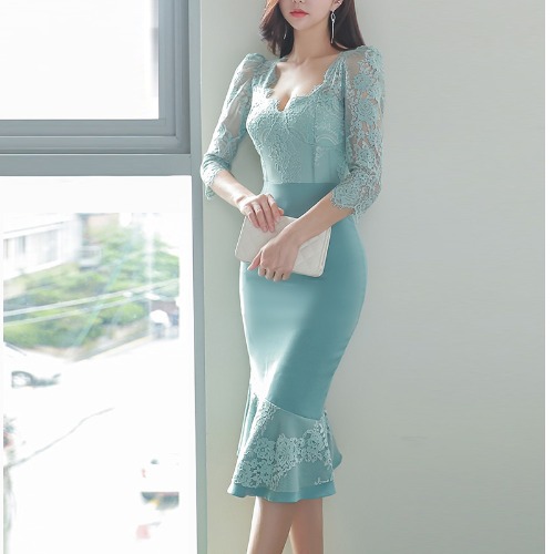 七分袖レースが大人の魅力を引き立て、特別な夜を彩る一着です。