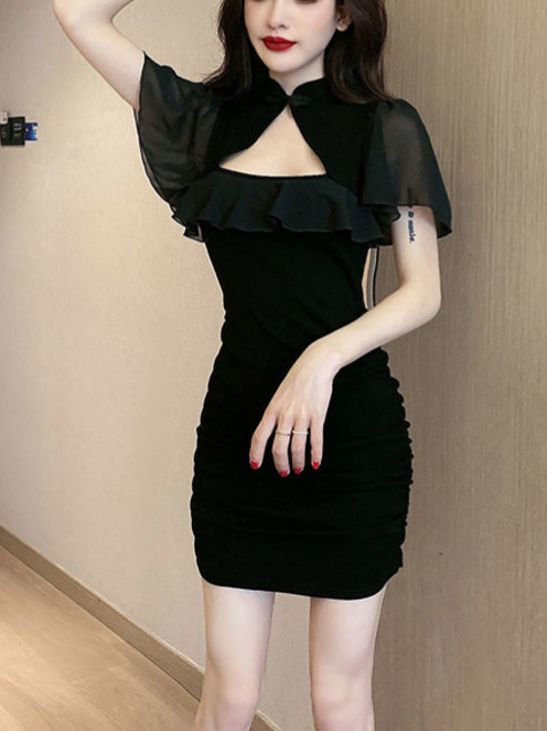 胸元のカットアウトデザインと透け感のあるケープが魅力的で、キャバドレスとしても最適です。