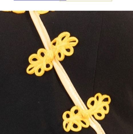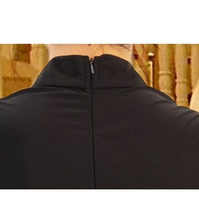 チャイナボタンが胸元を華やかに彩り、立ち襟がエレガントな印象を演出します。