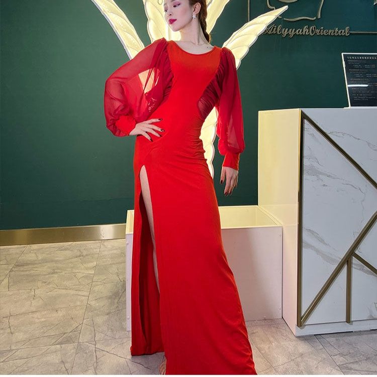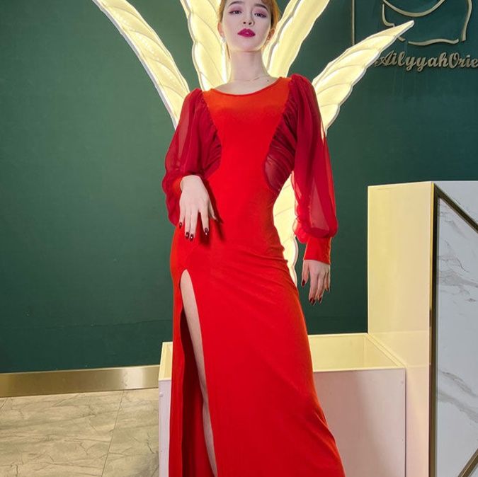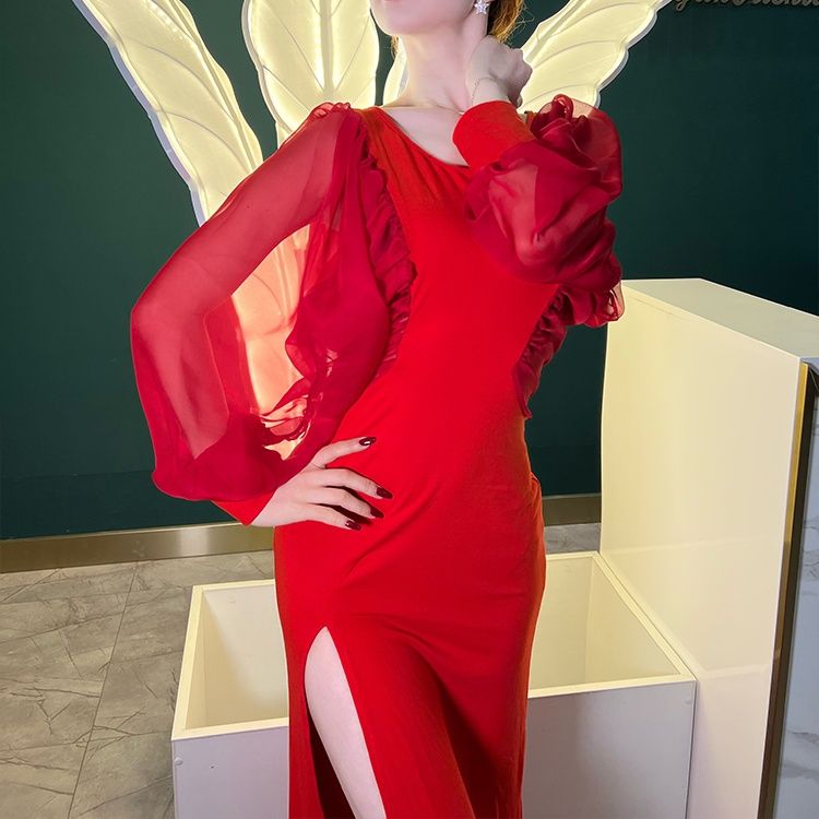 サイドに入った深めのスリットが美脚を演出し、歩くたびに揺れる裾が優雅な雰囲気を醸し出します。