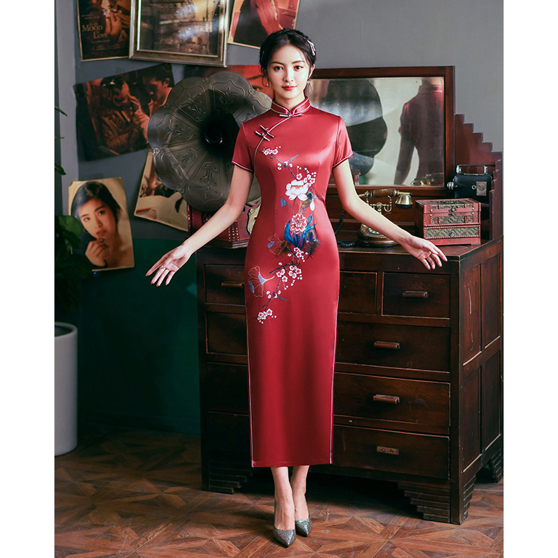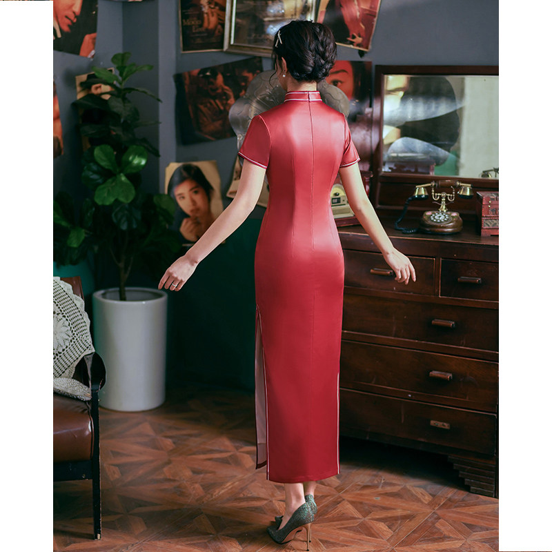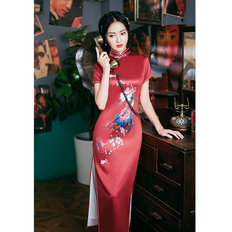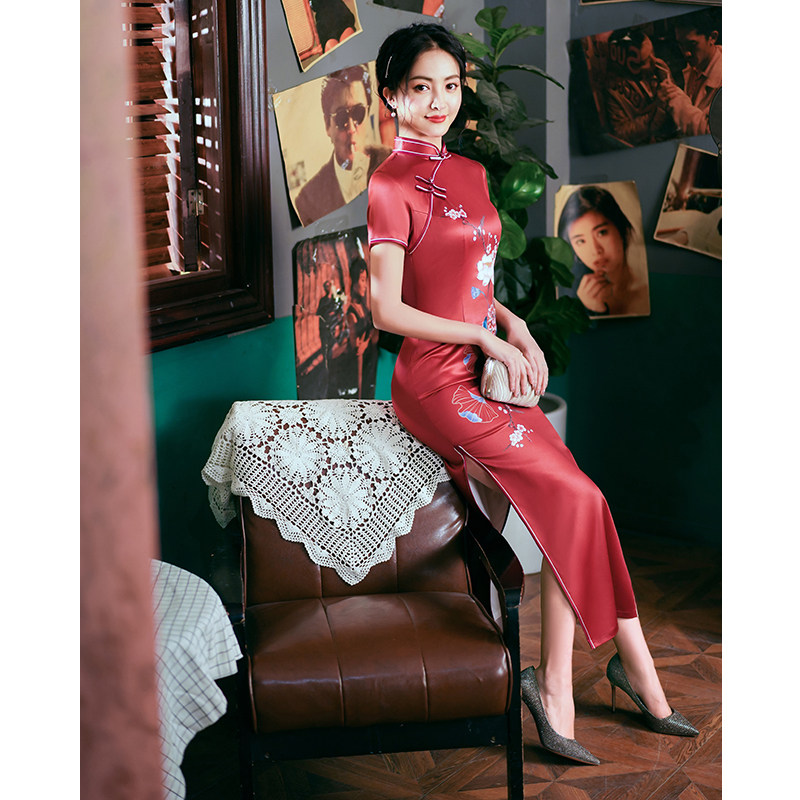 身体のラインを美しく魅せるスリムなシルエットのチャイナドレスで、サイドには深めのスリットを配しました。