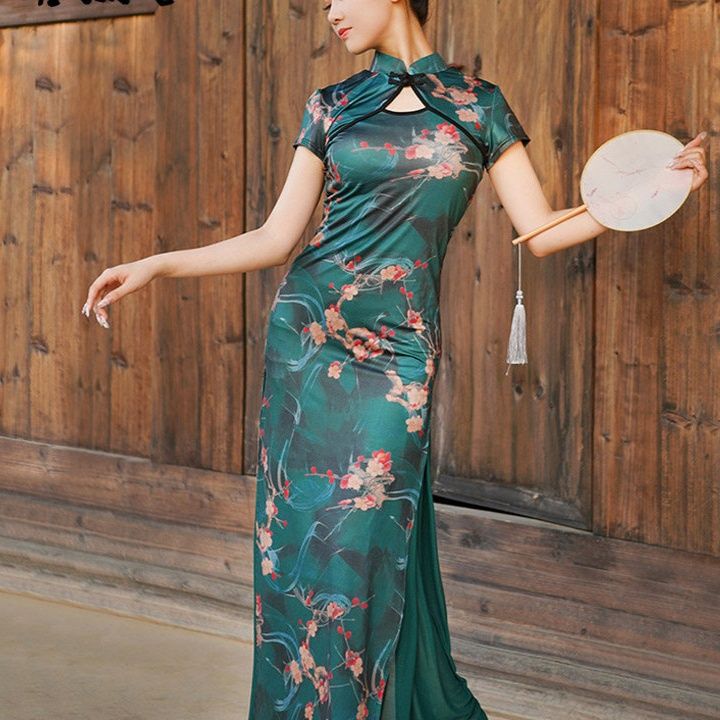 エレガントな梅花柄が全体に施された上品なキャバドレスです。 チャイナ特有の立襟と胸元の装飾的な開きが女性らしさを引き立てます。 身体のラインに沿ったシルエットと裾に向かって広がるデザインが優雅な印象を演出します。 半袖タイプで動きやすく、特別な日のパーティーやお店での接客にも最適な一着です。 和の風情と華やかさを兼ね備えた、周囲と差をつけられる逸品となっております。