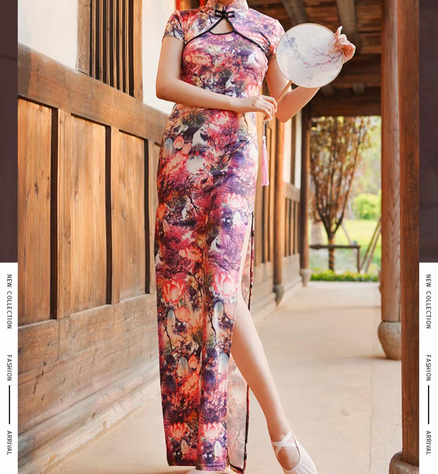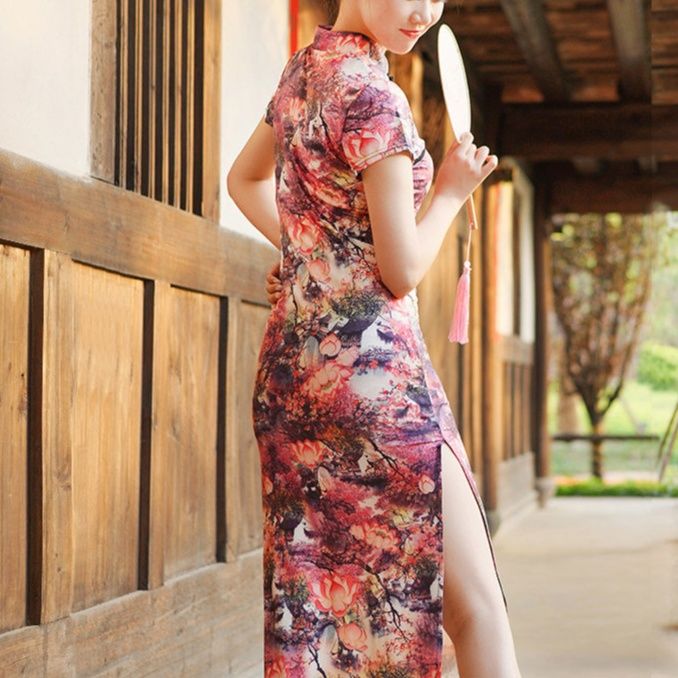 チャイナ特有の立襟と胸元の装飾的な開きが女性らしさを引き立てます。
