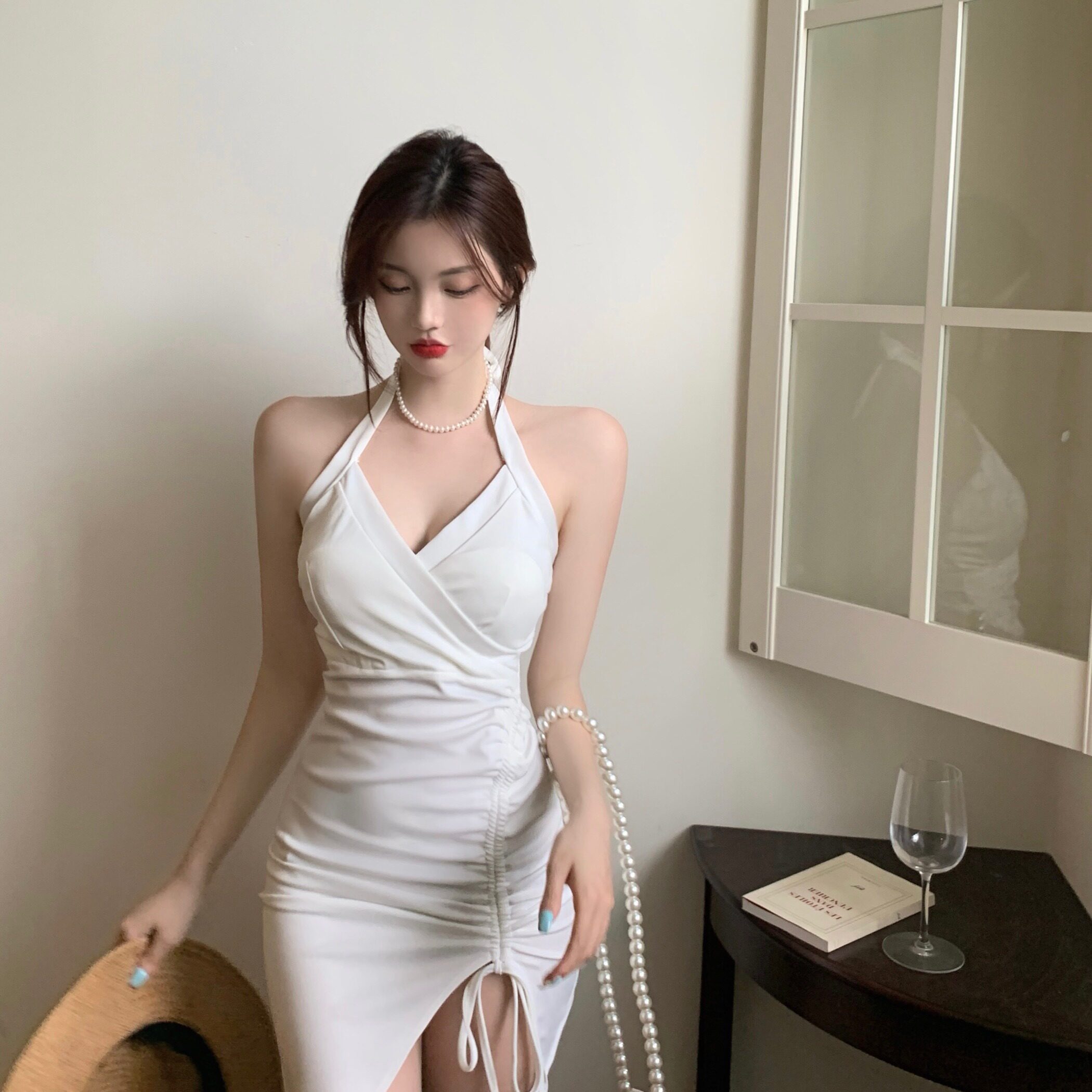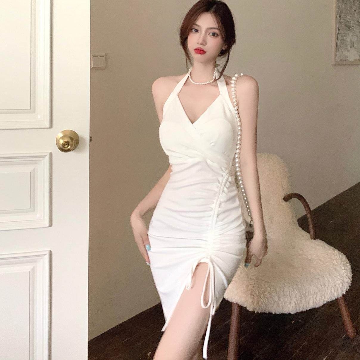 華やかなシーンを演出するキャバドレスです。 首元で結ぶホルターネックデザインが肩周りをすっきりと見せ、深めのVネックが女性らしいデコルテを美しく演出します。 体のラインに沿ったタイトシルエットがスタイルを際立たせ、裾の絞りデザインがアクセントになっています。 サイドのスリットが足さばきを良くし、歩く姿も優雅に魅せてくれる一着です。 特別な夜にぴったりのエレガントなドレスです。