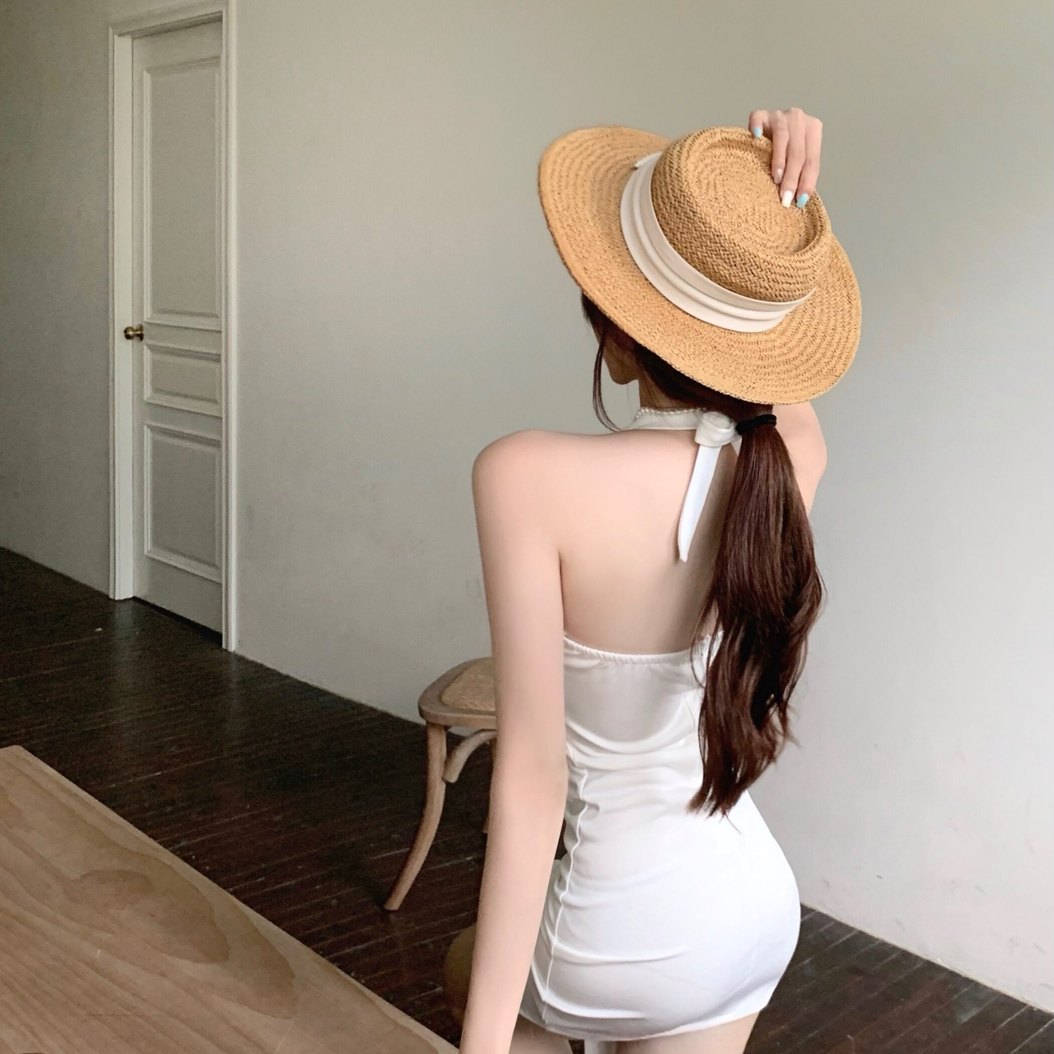 首元で結ぶホルターネックデザインが肩周りをすっきりと見せ、深めのVネックが女性らしいデコルテを美しく演出します。