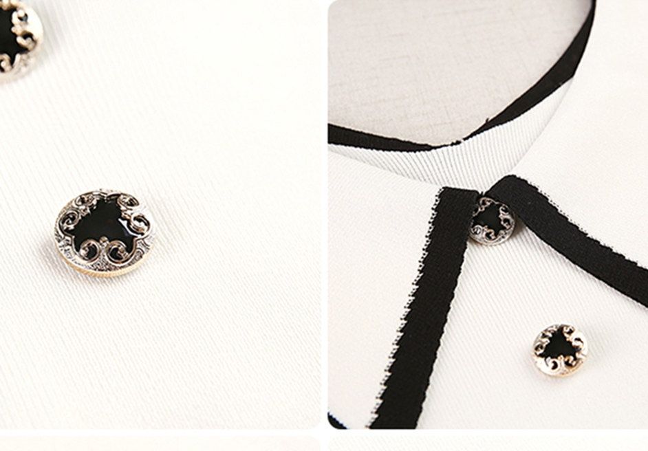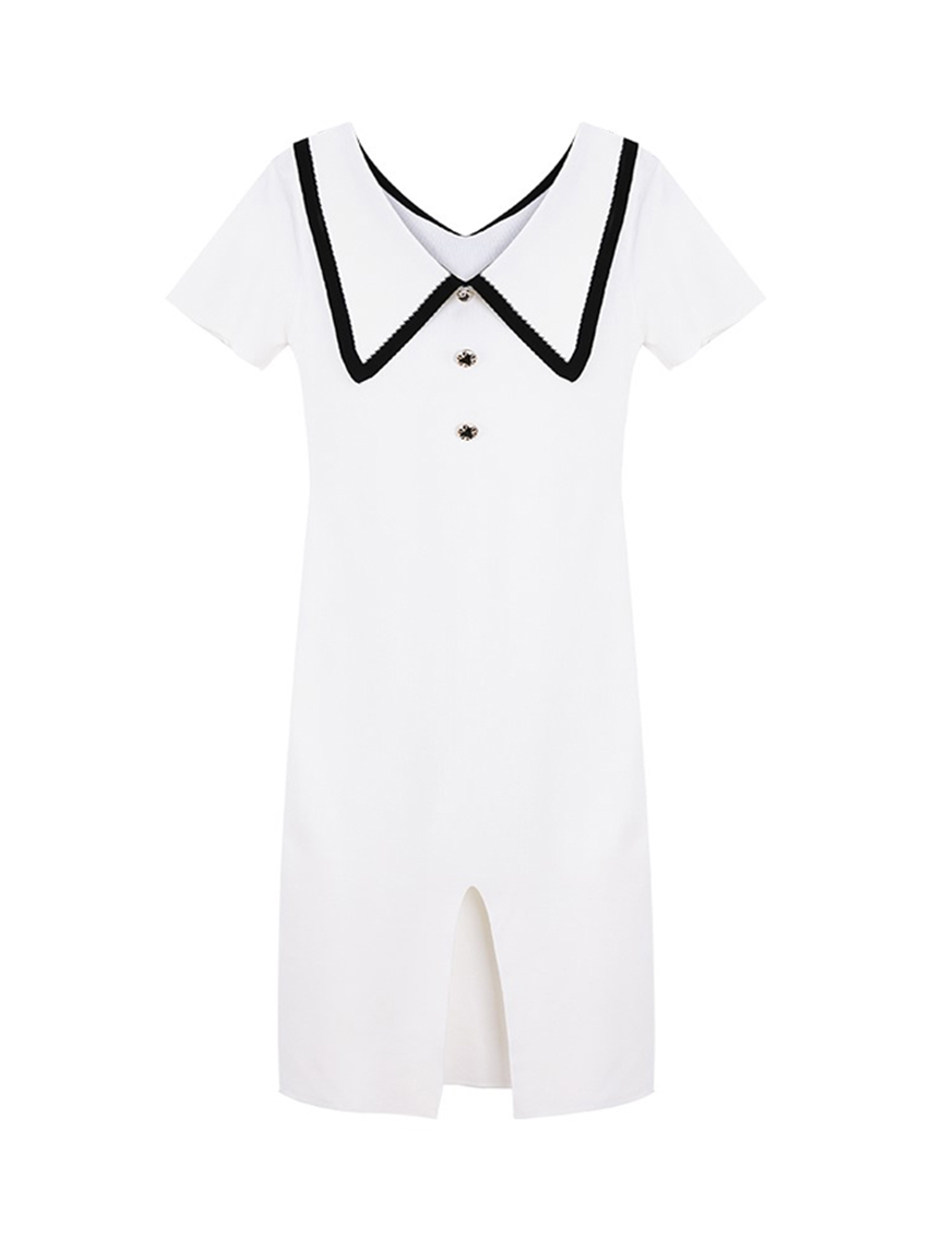 大きめのセーラー襟に施された配色パイピングが顔周りを華やかに演出し、小顔効果も期待できます。