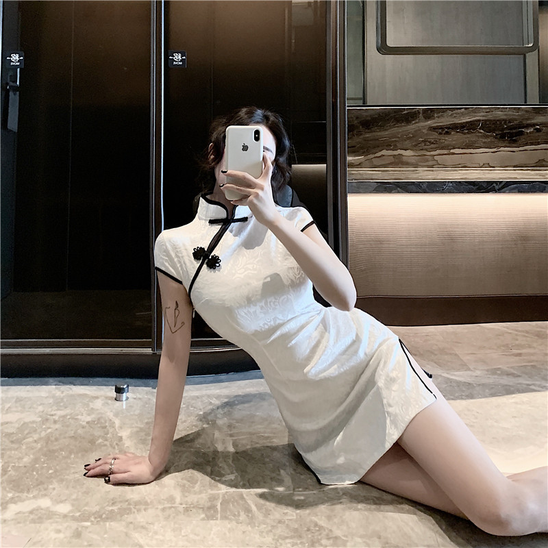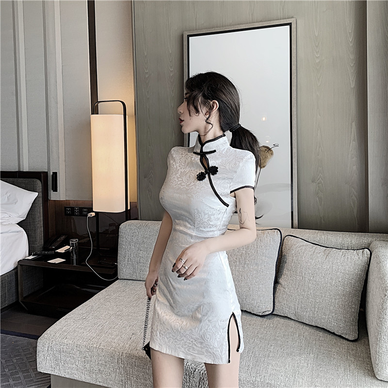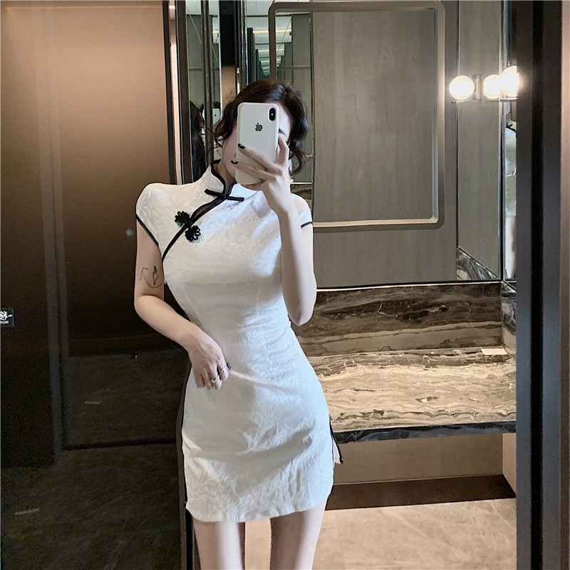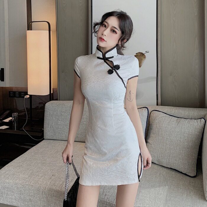 本格的なチャイナデザインが特徴で、立襟と装飾的なチャイナボタンが上品な雰囲気を演出します。