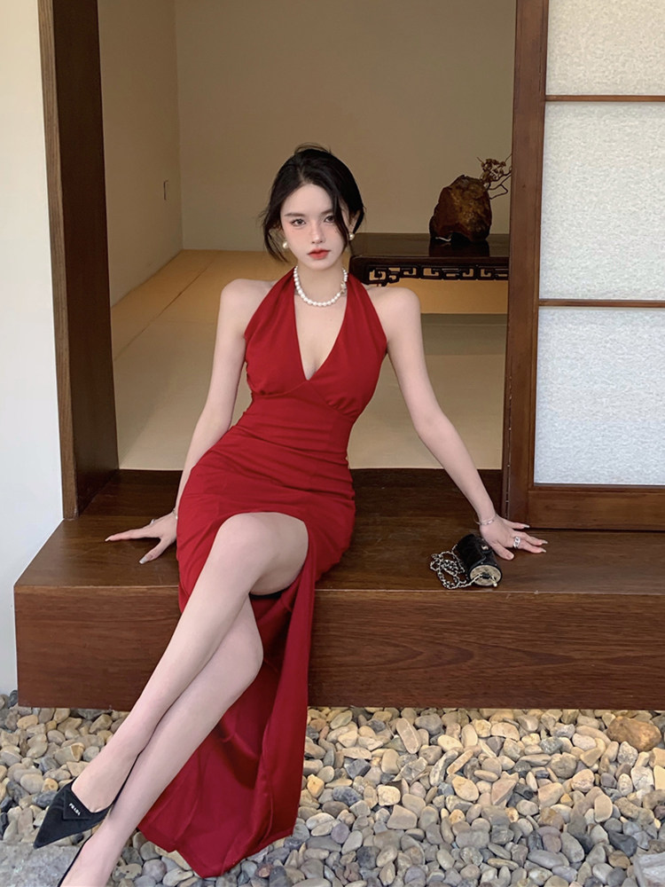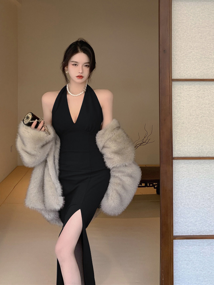大胆な深Vネックと背中見せデザインが魅力的なキャバドレスです。 ホルターネックで首元をすっきりと見せながら、フロントのドレープが女性らしい立体感を演出します。 ボディラインに沿ったタイトシルエットとサイドスリットが美脚効果を高め、特別な夜を華やかに彩ります。 シンプルながらもセクシーで洗練されたデザインは、どんなシーンでも視線を集める一着です。