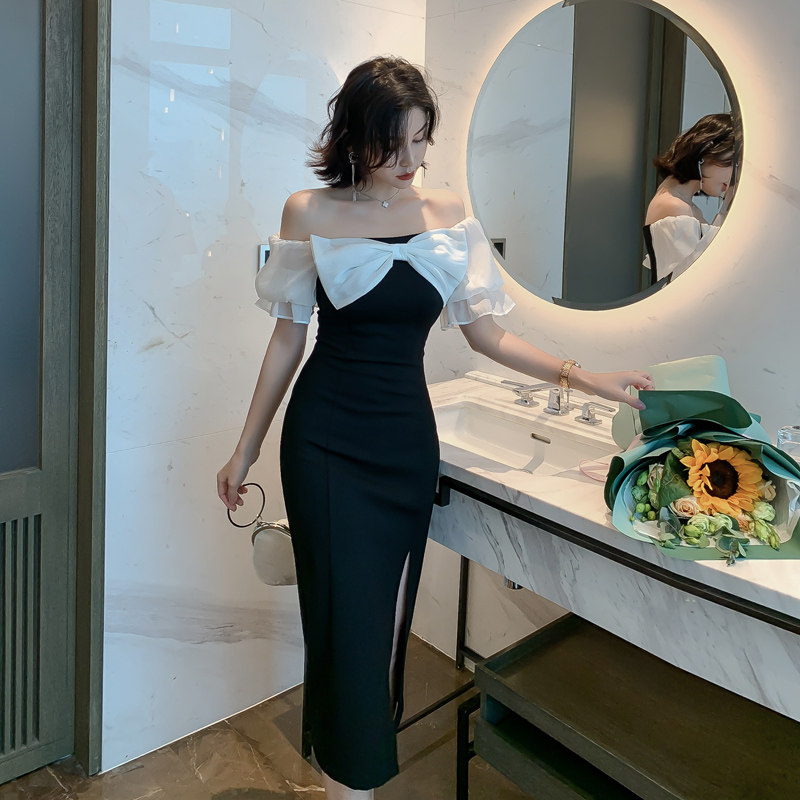 胸元の大きなリボンモチーフが目を引くエレガントなキャバドレスです。