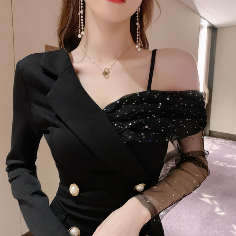 キャミソール仕様の肩見せと、テーラードジャケット風の片身頃が洗練された印象を演出します。
