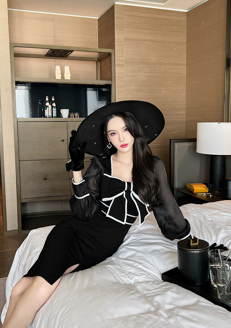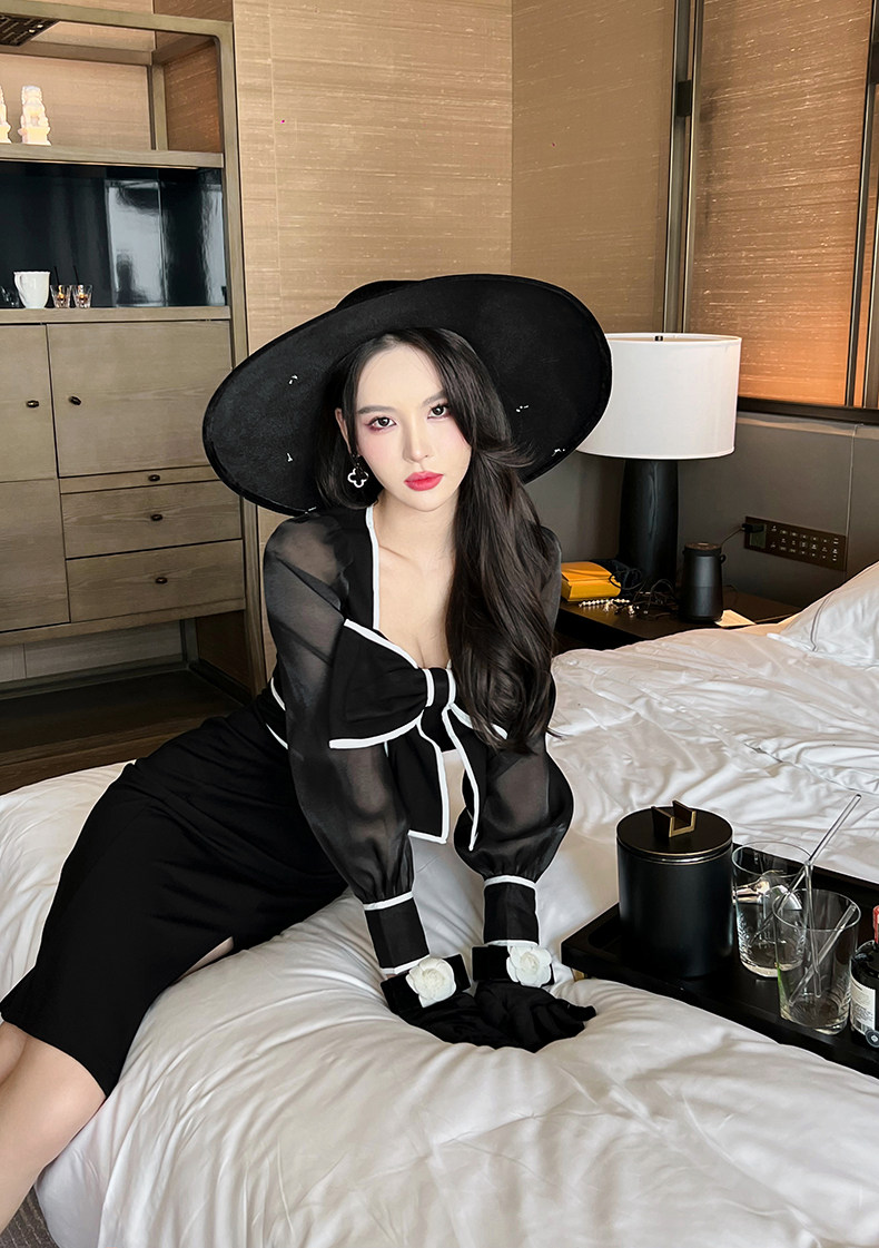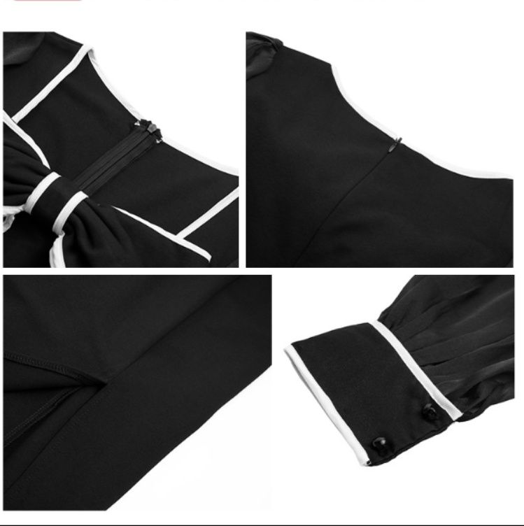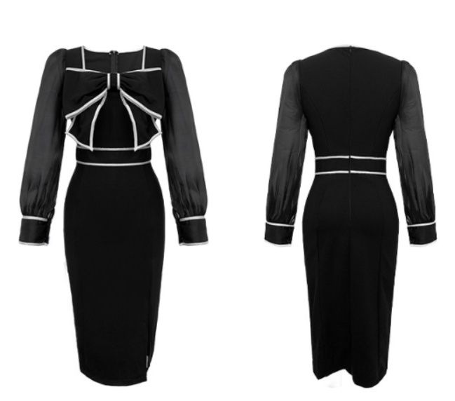 配色パイピングがボディラインを美しく引き立て、スリット入りのタイトスカートが女性らしい色気を醸し出します。
