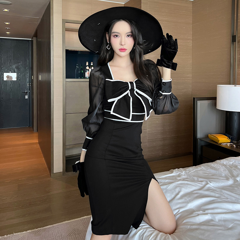 胸元の大きなリボンデザインが印象的なキャバドレスです。